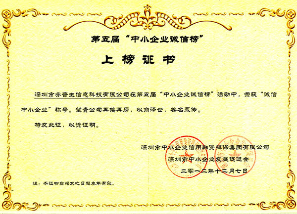 • 誠信中小企業(yè)證書